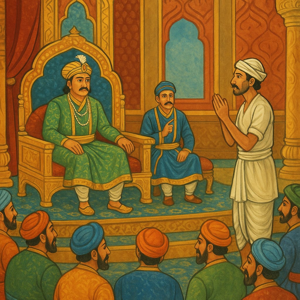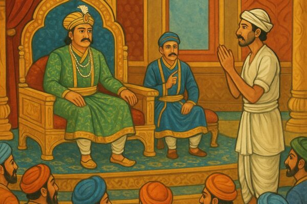 आगरा का राजदरबार उस दिन भी वैसे ही भरा हुआ था, जैसा वह प्रतिदिन रहता था। संगमरमर की शीतल फर्श पर दूर-दूर तक दरबारियों की पंक्तियाँ सजी थीं और सिंहासन पर बादशाह अकबर गंभीर मुद्रा में बैठे हुए राजकार्य देख रहे थे। तभी द्वार पर हलचल हुई।एक थका-हारा किसान फटे वस्त्रों में दरबार के भीतर…